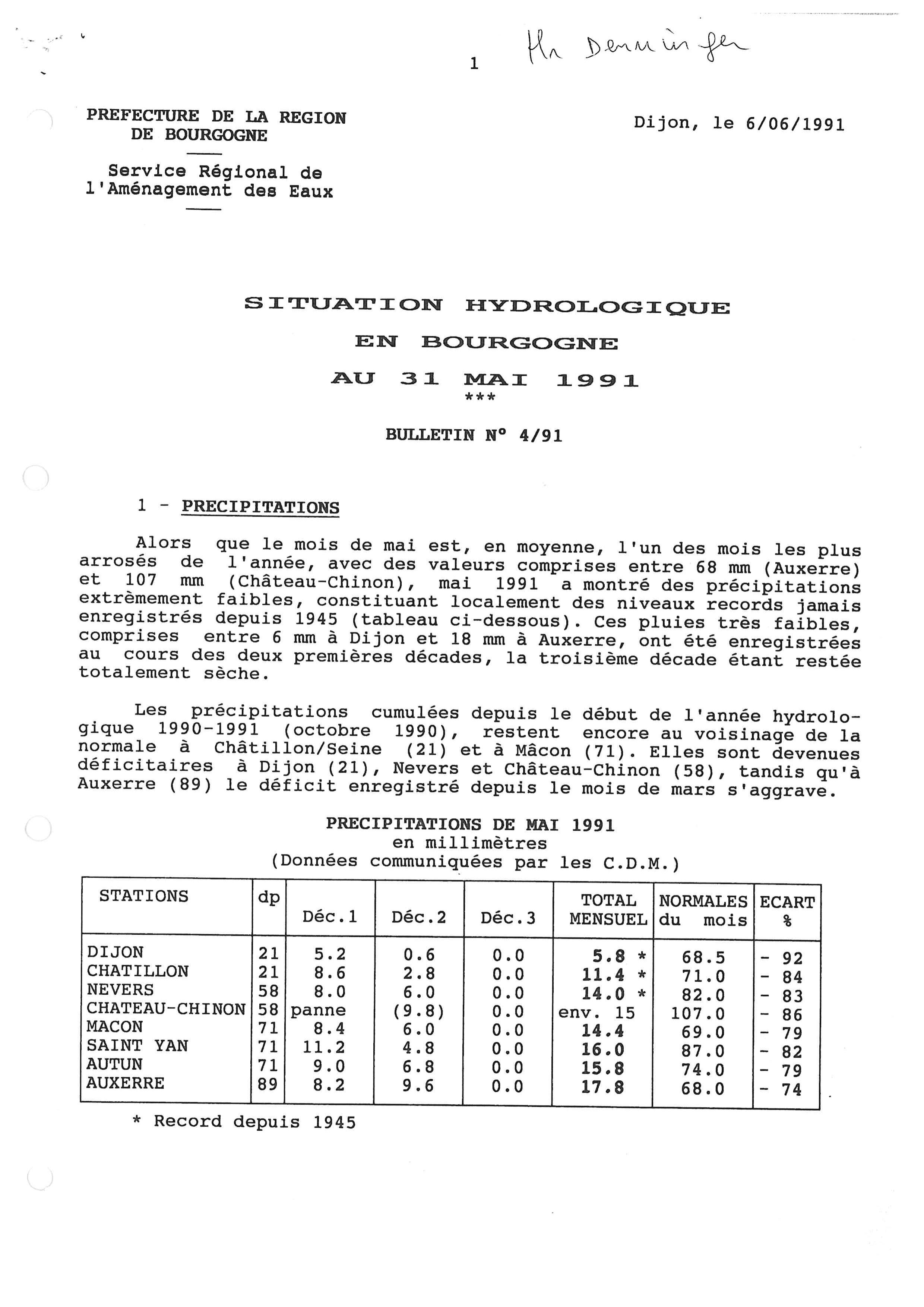 Bulletin hydrologique mai 1991