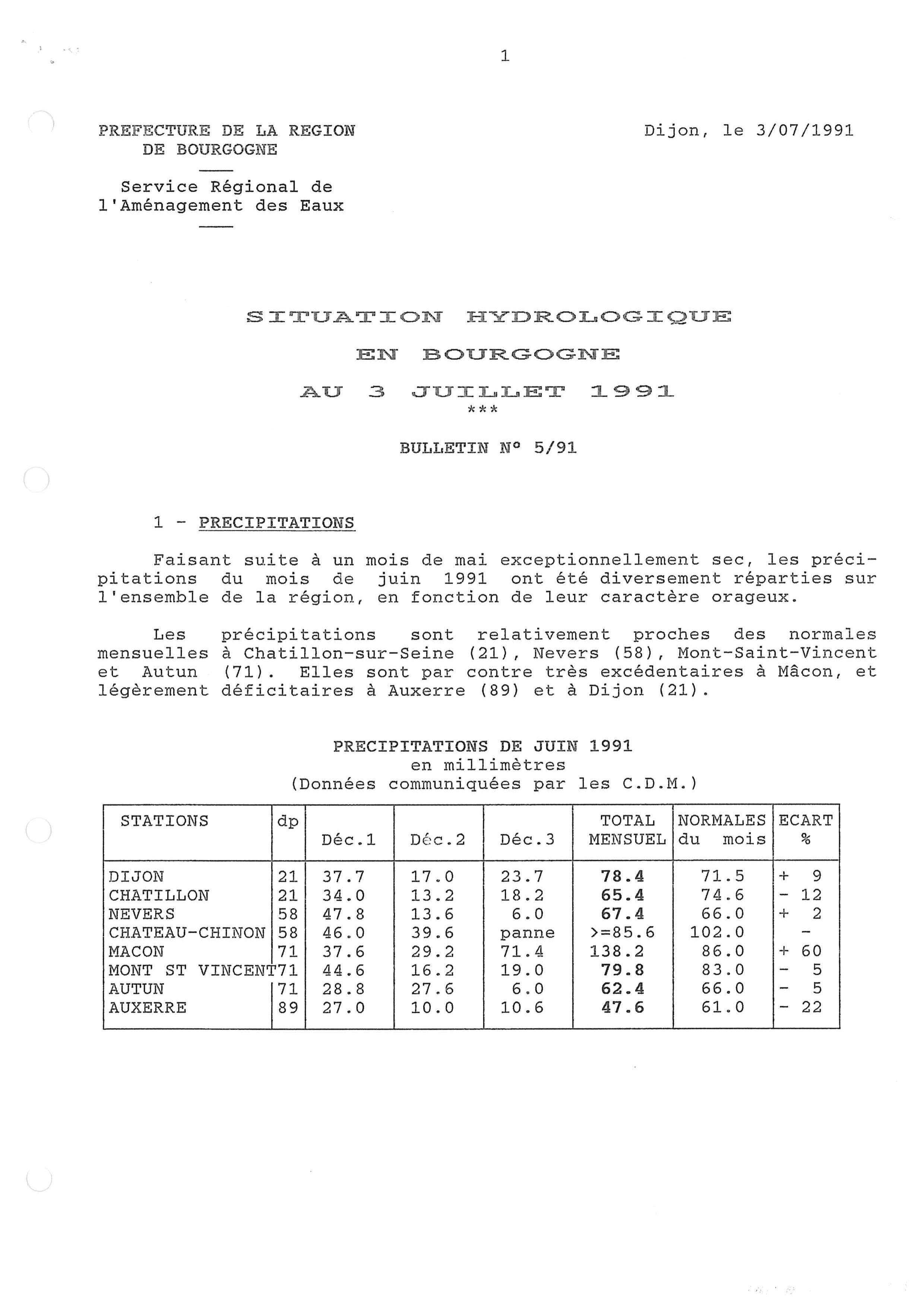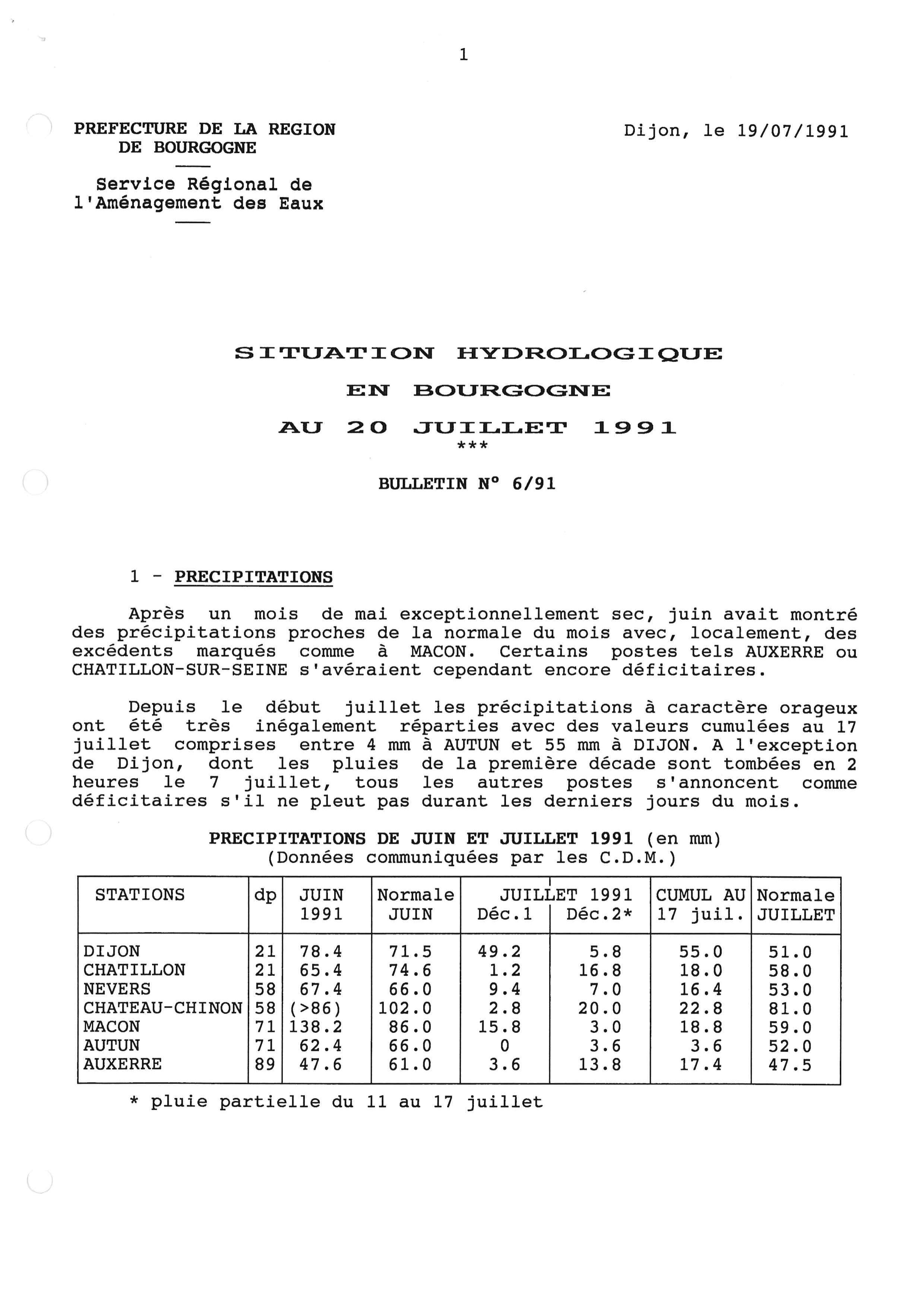 Bulletin hydrologique juin 1991 et juillet 1991