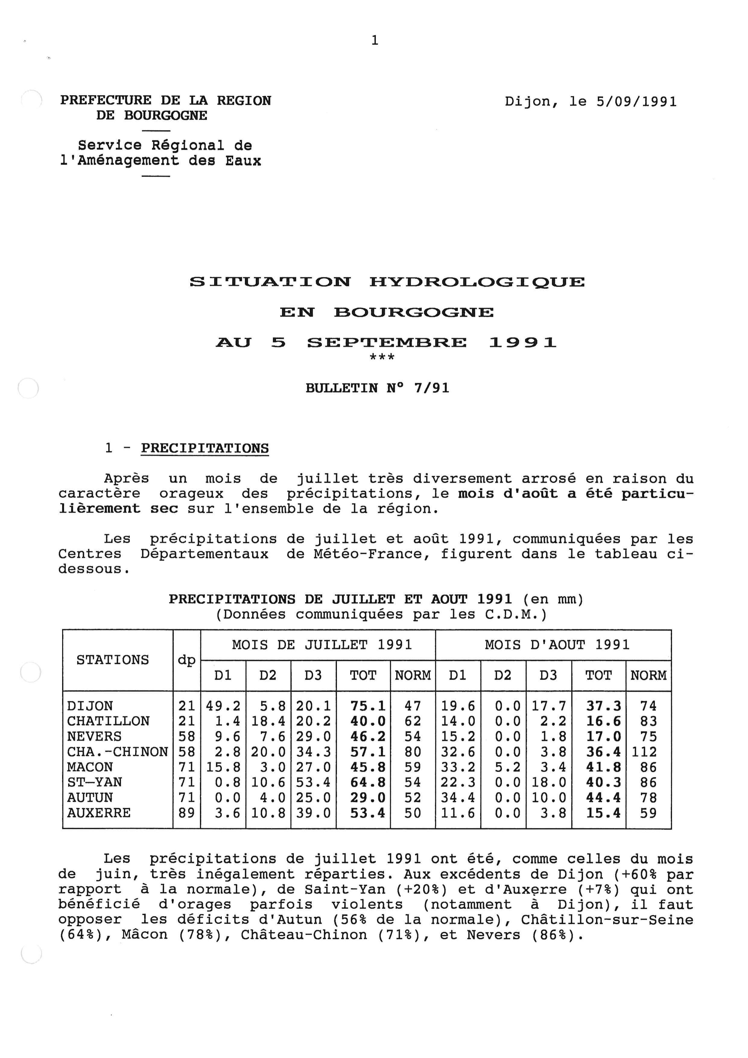 Bulletin hydrologique juillet 1991 et août 1991