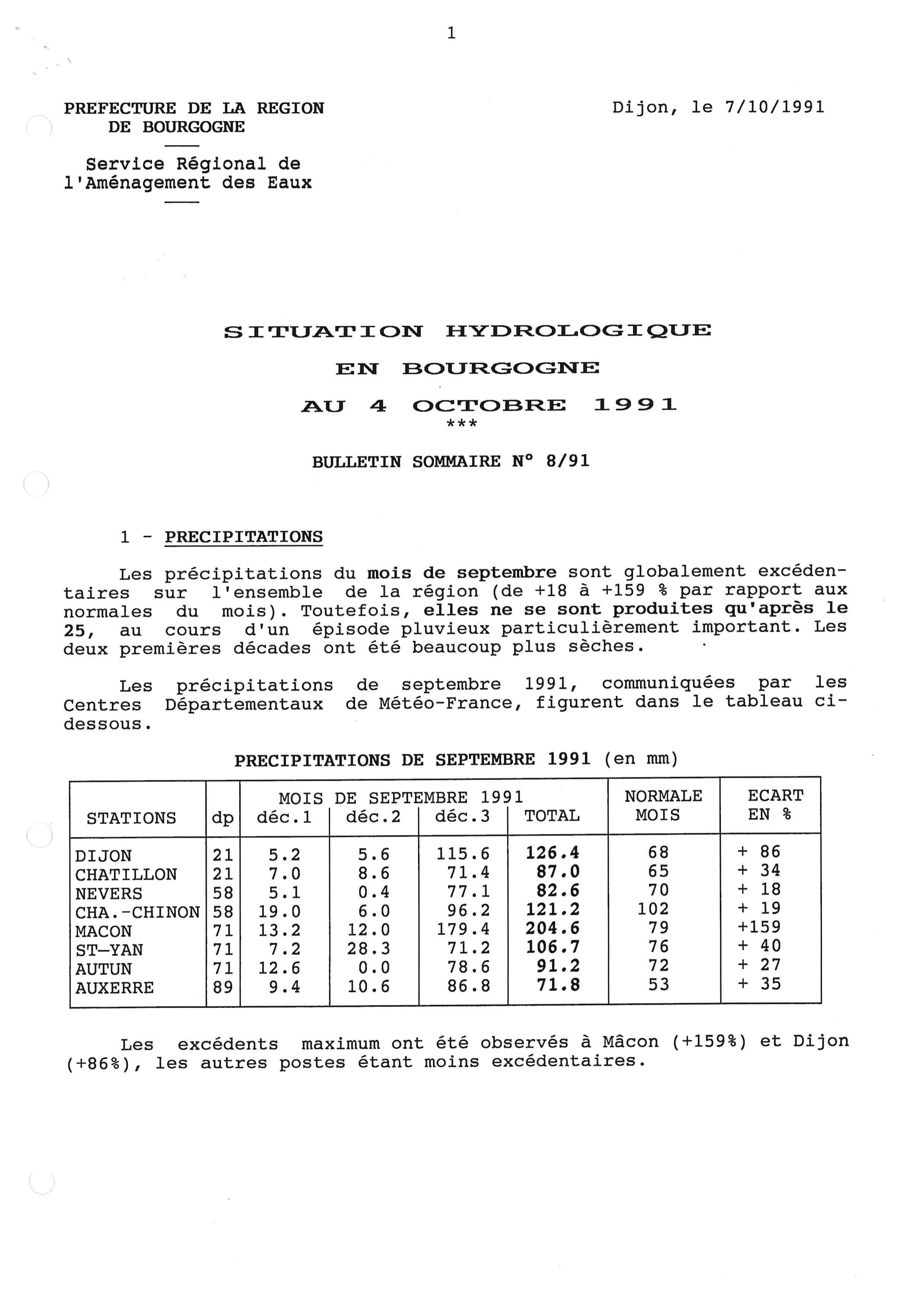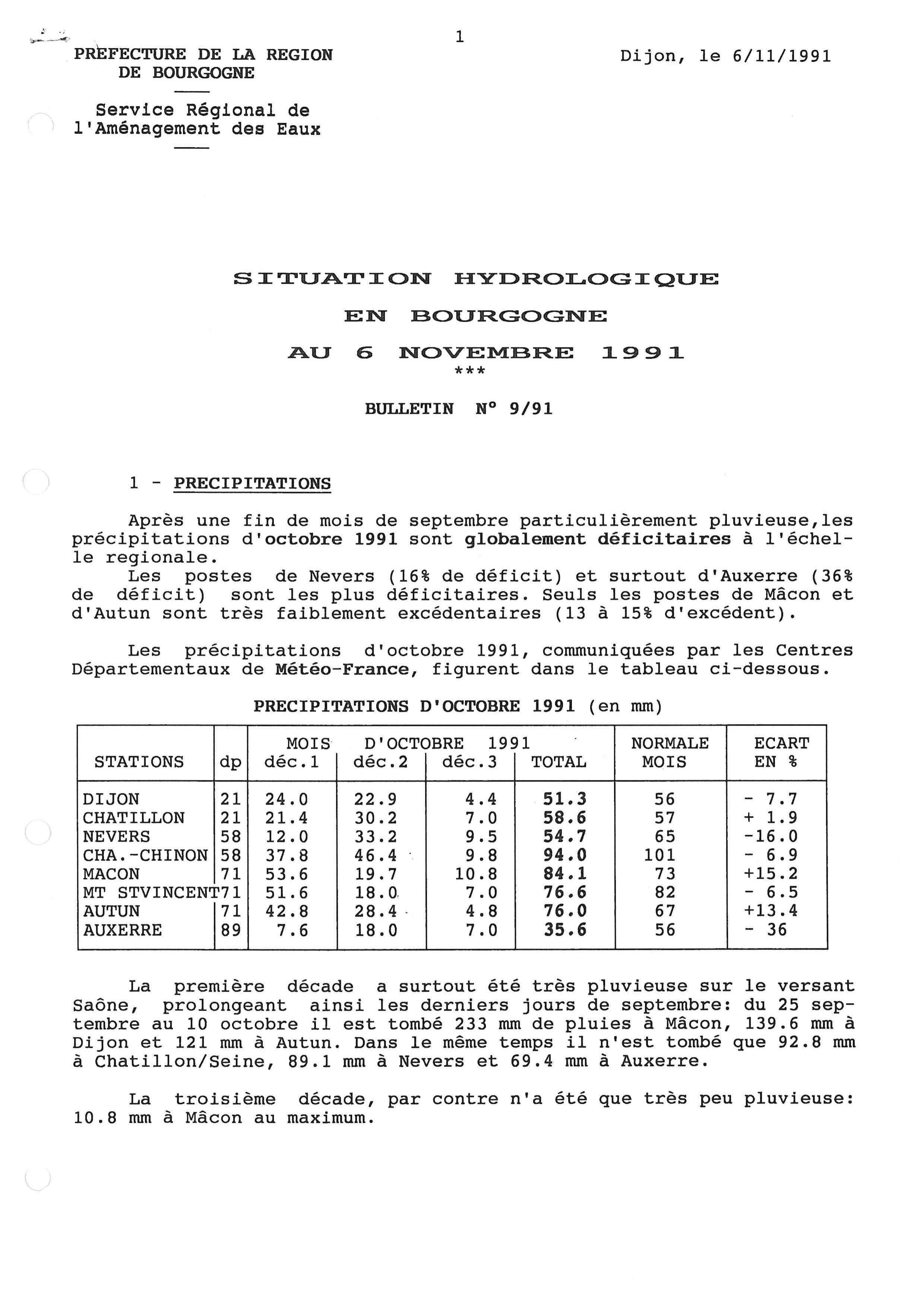 Bulletin hydrologique octobre 1991
