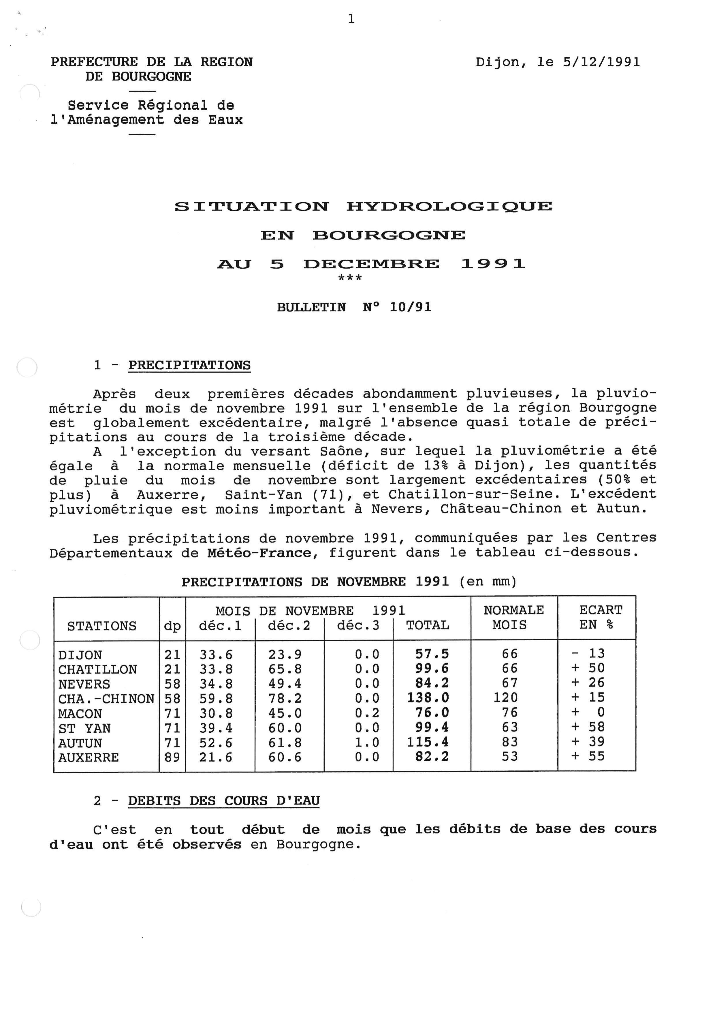 Bulletin hydrologique novembre 1991