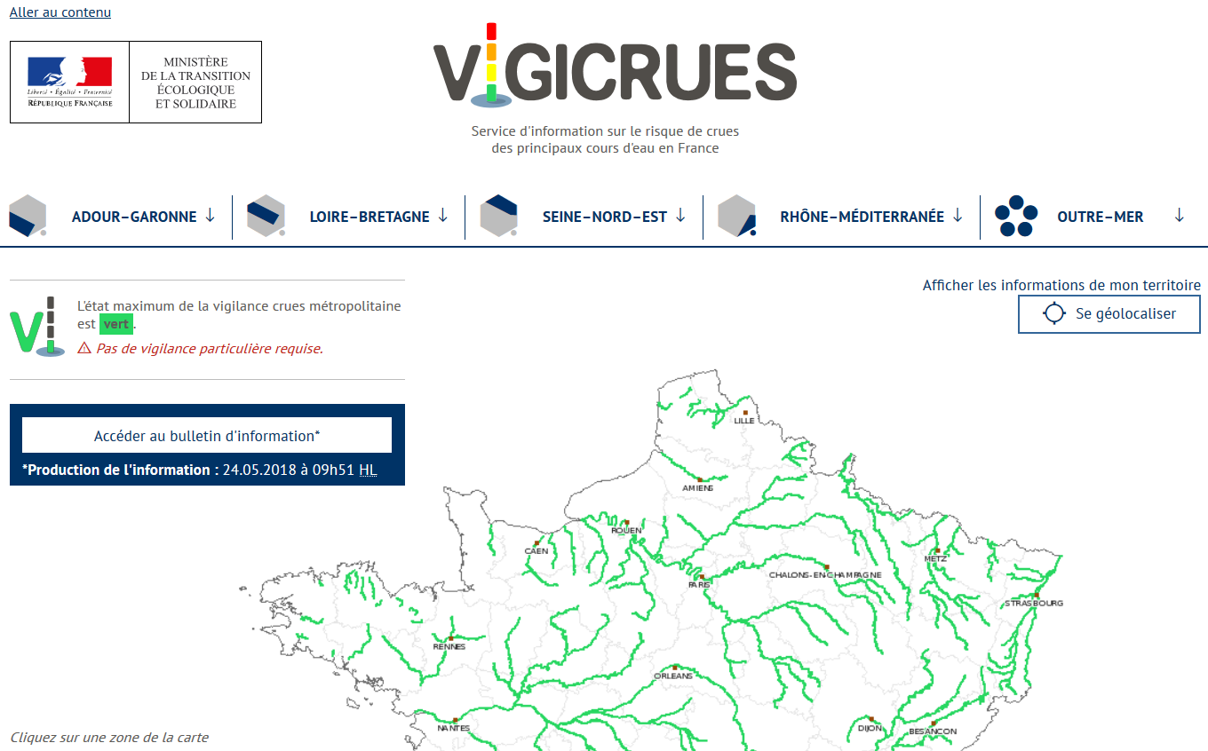 - Elle localise le niveau de vigilance par tronçons ou ensembles de cours d’eau sur les 22 800 km du réseau hydrographique continental surveillé par l’État, aux abords desquels se situent plus de 75 % de la population qui vit ou travaille en zone inondable.